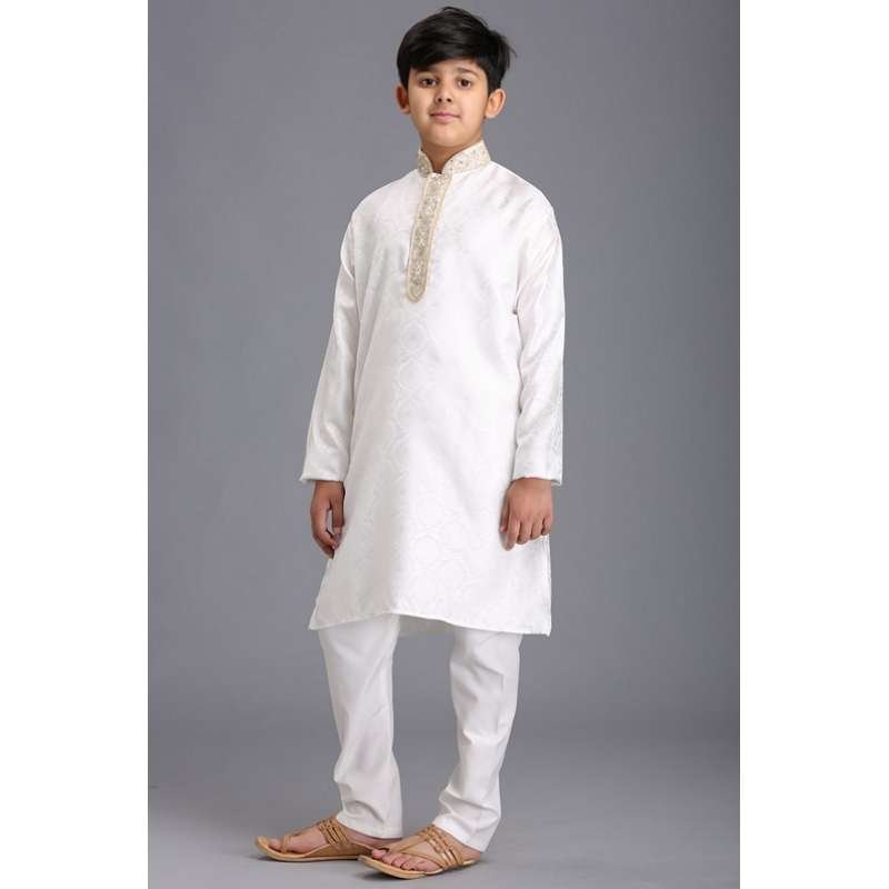 Make your little one stand out in this off white and gold embroidered kurta pajama set, designed with a self-print base, intricate embroidery, and stone embellishments on the ban collar and neckline. Paired with a matching churidar, it's perfect for festive occasions.