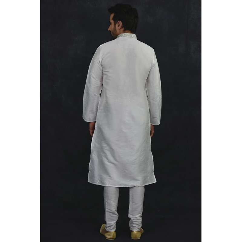 This plain off-white kurta pajama set features a silver embroidered band collar and a matching pajama.