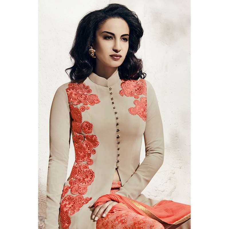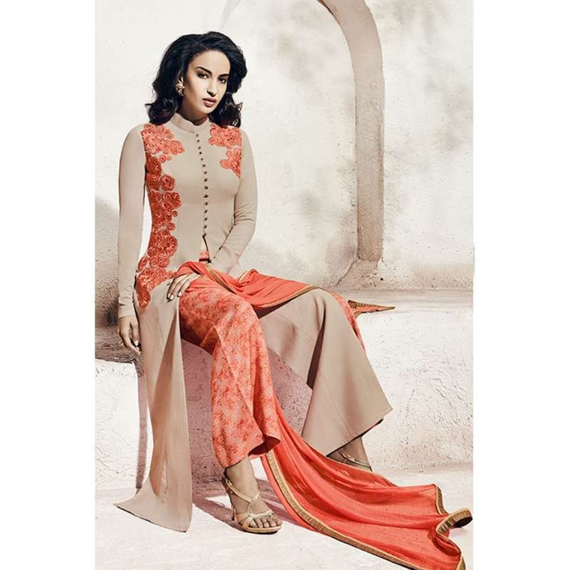 Step into elegance with this Beige Palazzo Style Casual-Formal Suit from Asian Couture. The georgette top is beautifully adorned with peach floral resham embroidery and paired with a floral printed santoon palazzo bottom. A peach chiffon dupatta with delicate hand booties completes the graceful look — ideal for semi-formal gatherings, festive wear, or classy daytime events.