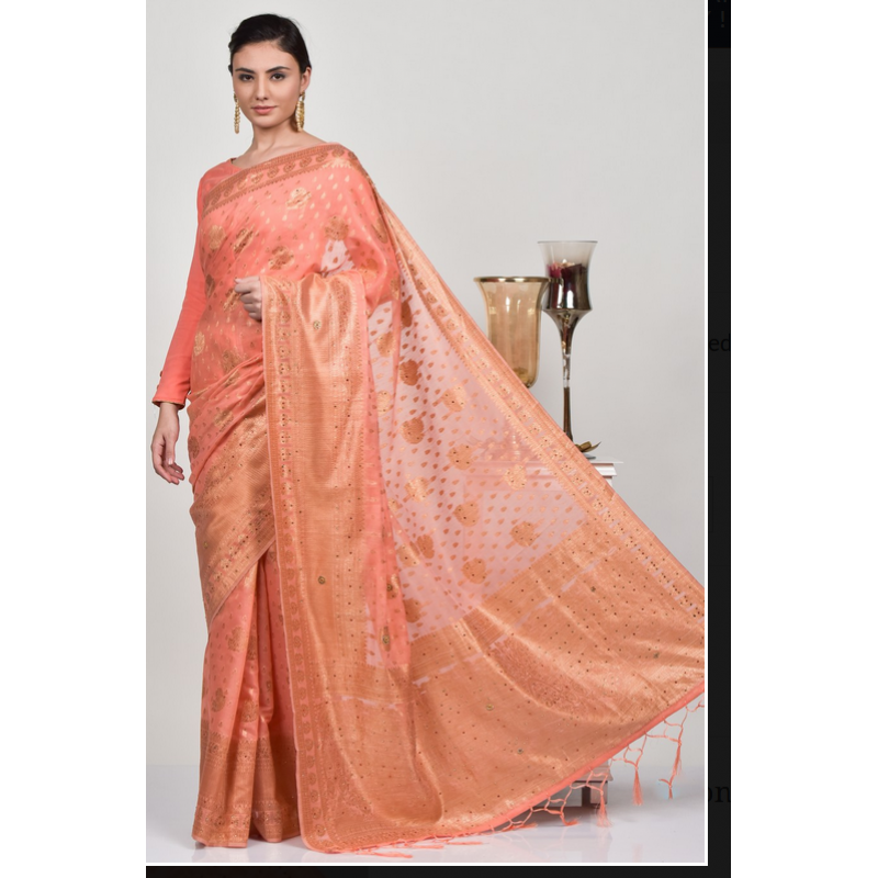 Beautiful linen fabric weaved Peach Bollywood Diva Saree with heavy stone work.