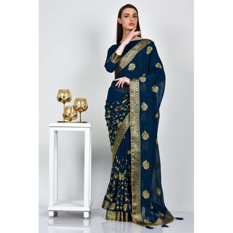 Petrol Blue Embroidered Evening Party Saree