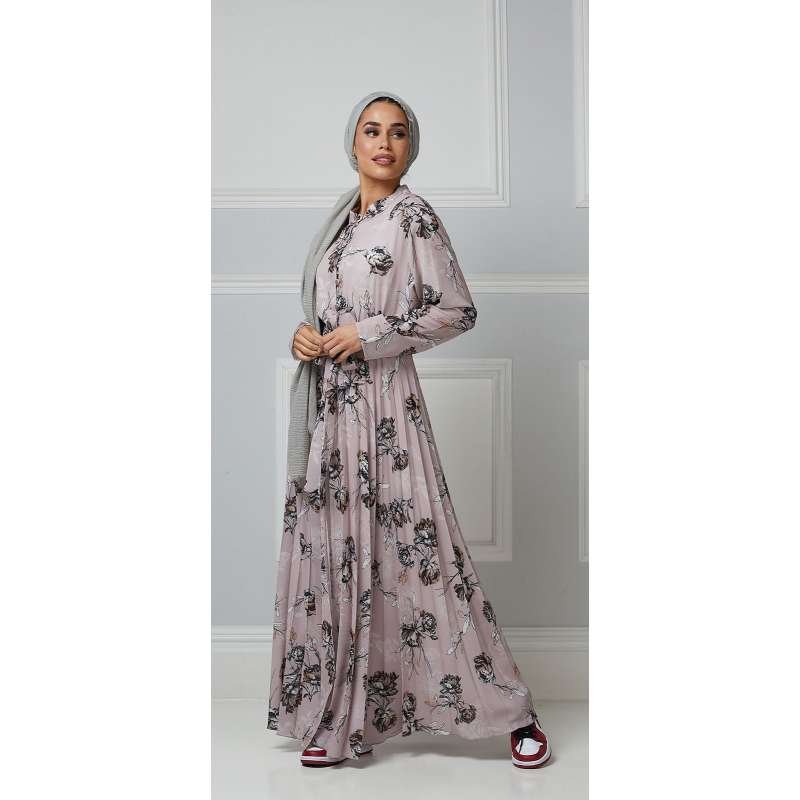 A beautiful maxi inspired abaya featuring a sunray pleated skirt. Styling details include a mandarin collar with loophole button fastening along the centre front. A belt is attached to achieve a more structured look to compliment the pleated skirt.