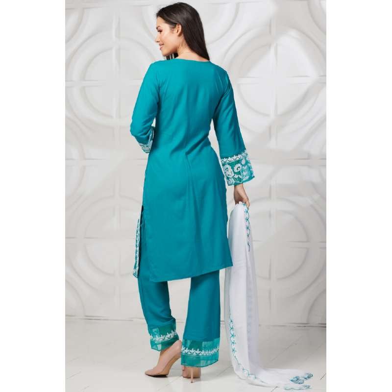 Beautiful Rama Green color kurti with white embroidery and pearl buttons on neckline. It is paired with same color trouser with embroidery on ends and white malmal dupatta with four side contrast cutwork embroidery.