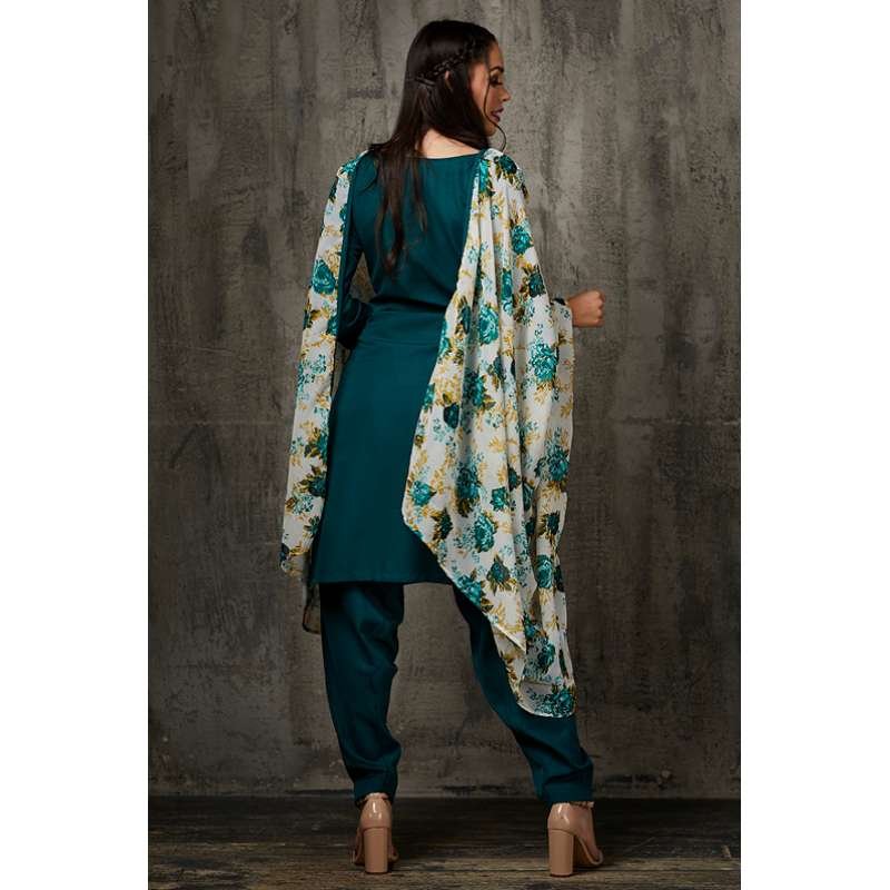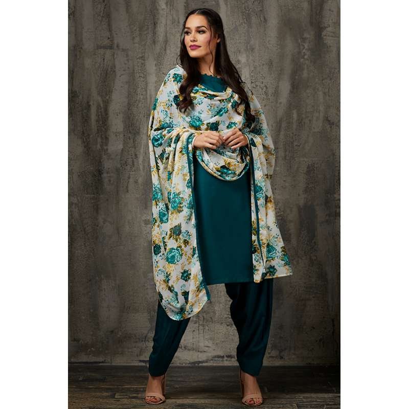 Stylish Rama Green colour salwar-suit with a printed dupatta and detailings on sleeves and neckline.