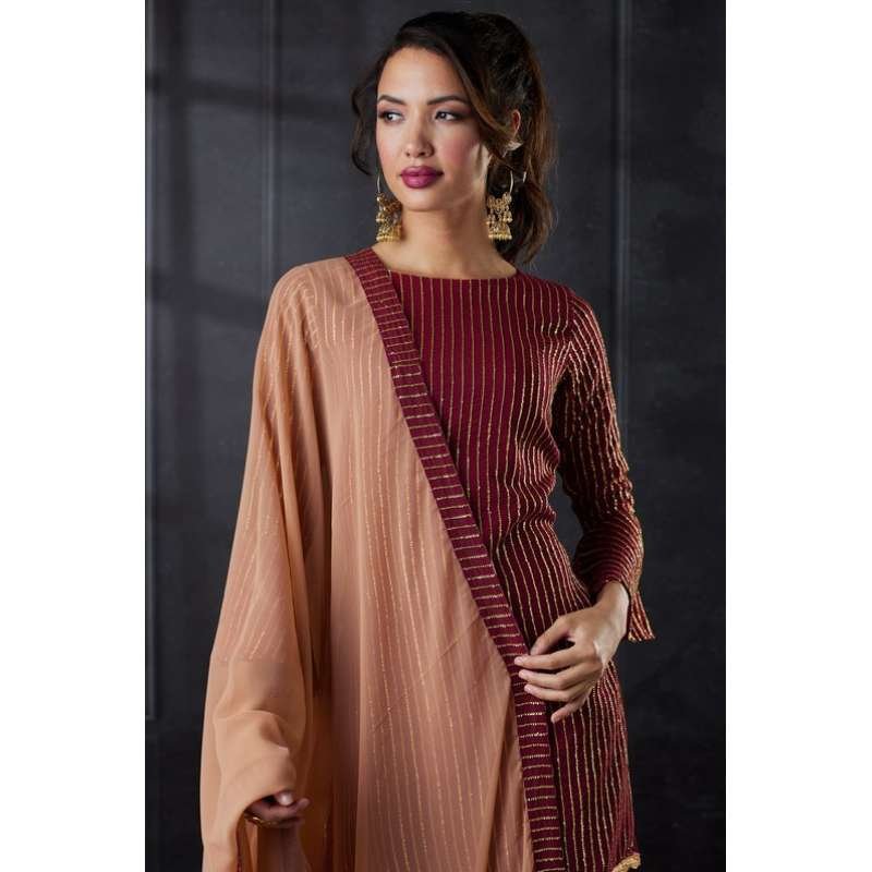 Maroon color sequins work slit cut kurti with matching heavy embroidered garara with contrast dupatta.
