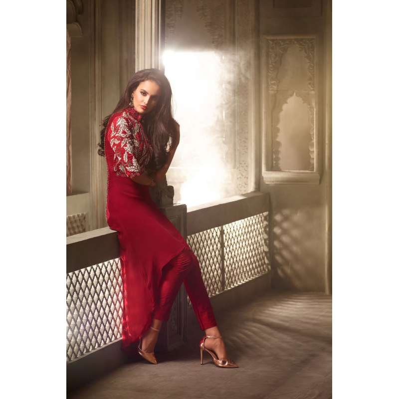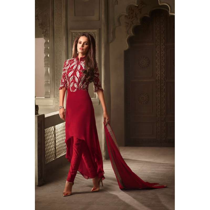 Maisha Maskeen Aster suit 3503 is a stunning, tale style party wear designed with quality Silk/Crepe material comes in red colour theme with thread embroideries, embellishments on kameez's front, back, pure crepe bottom and chiffon dupatta