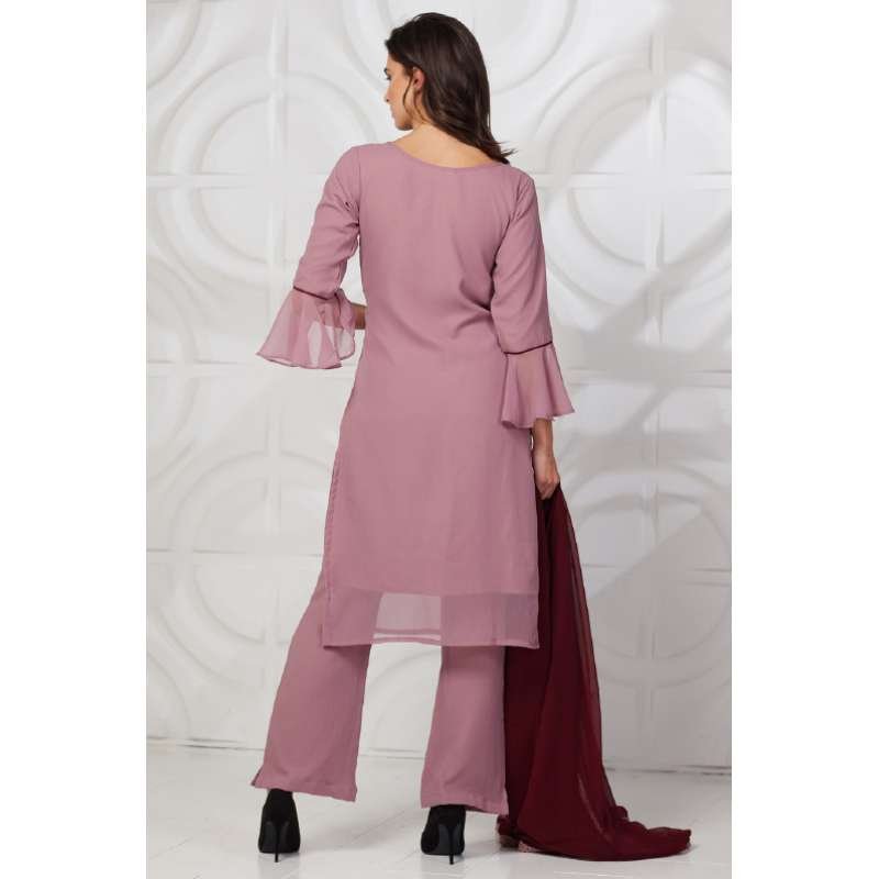 Beautiful rose pink georgette kurti with maroon embroidery and maroon buttons on neckline with bell sleeves. It is paired with plain georgette trouser and contrast dupatta with four side lace.
