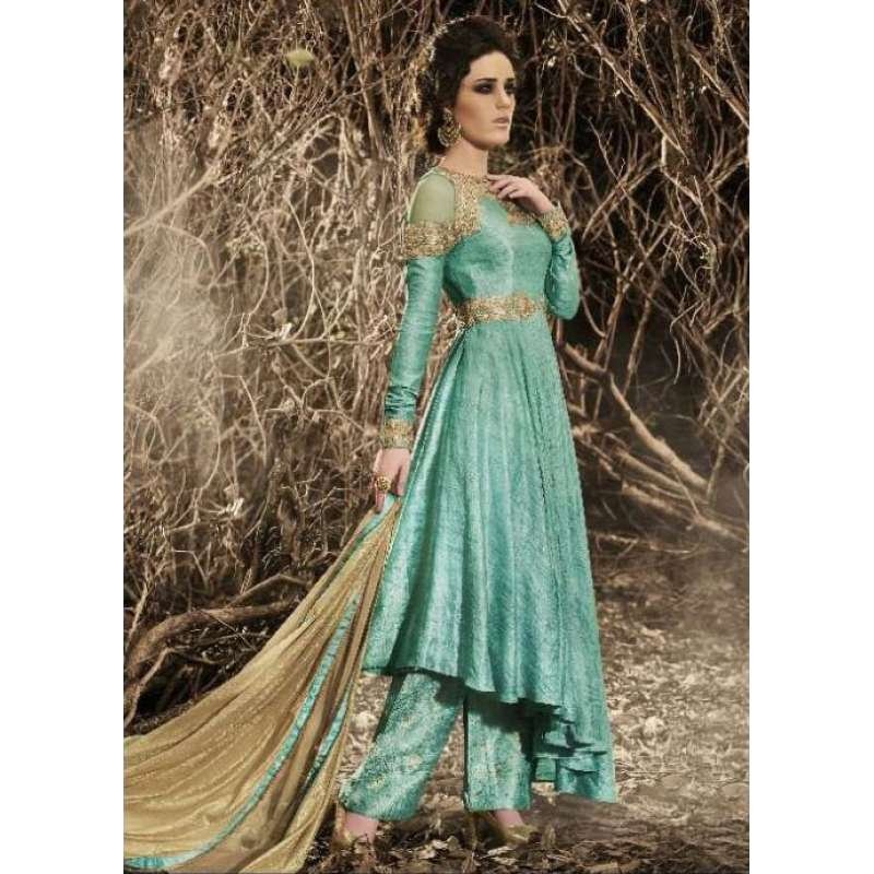 Exude regal charm with this turquoise and gold Indian wedding palazzo suit. Designed in a long Bhagalpuri kamiz style, this outfit features intricate embroidery and handwork on the neckline, shoulders, and sleeves. Paired with a soft santoon palazzo and a net dupatta, it offers elegance, comfort, and style—perfect for weddings, festive occasions, or formal parties.