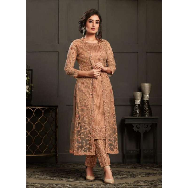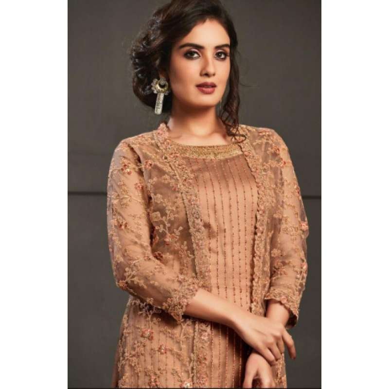 This urban style cool peach outfit offers a dual look with a sequined inner top and a tonal glitter cord embroidered jacket. carry this classic colour with an embroidered pant and equally beautiful net dupatta. satin inner included.