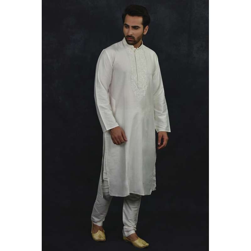 This plain white kurta pyjama set features an embroidered band collar and neckline and comes with a matching pyjama.