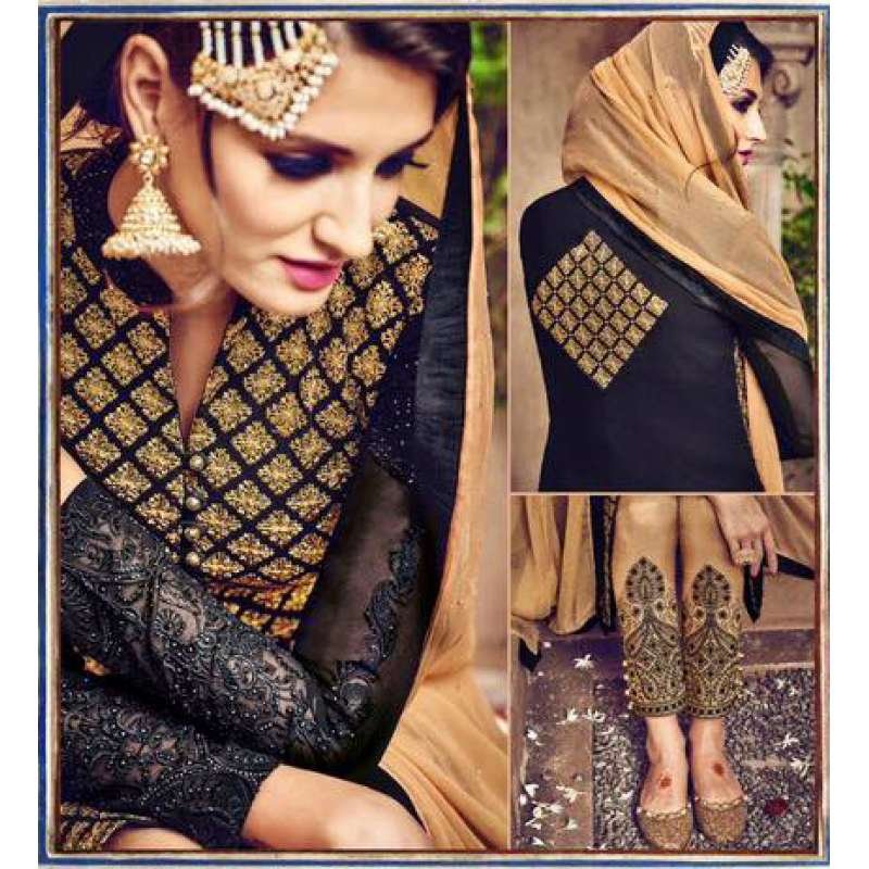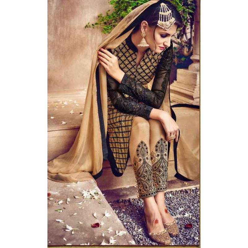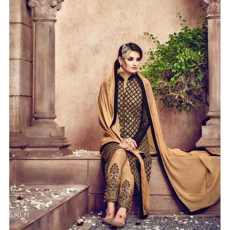 Omtex 81 Beige And Black Georgette Straight Cut Suit