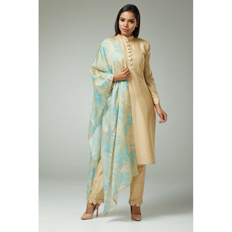 • Graceful band neck suit with golden buttons on scalloped neckline with contrast printed dupataa.