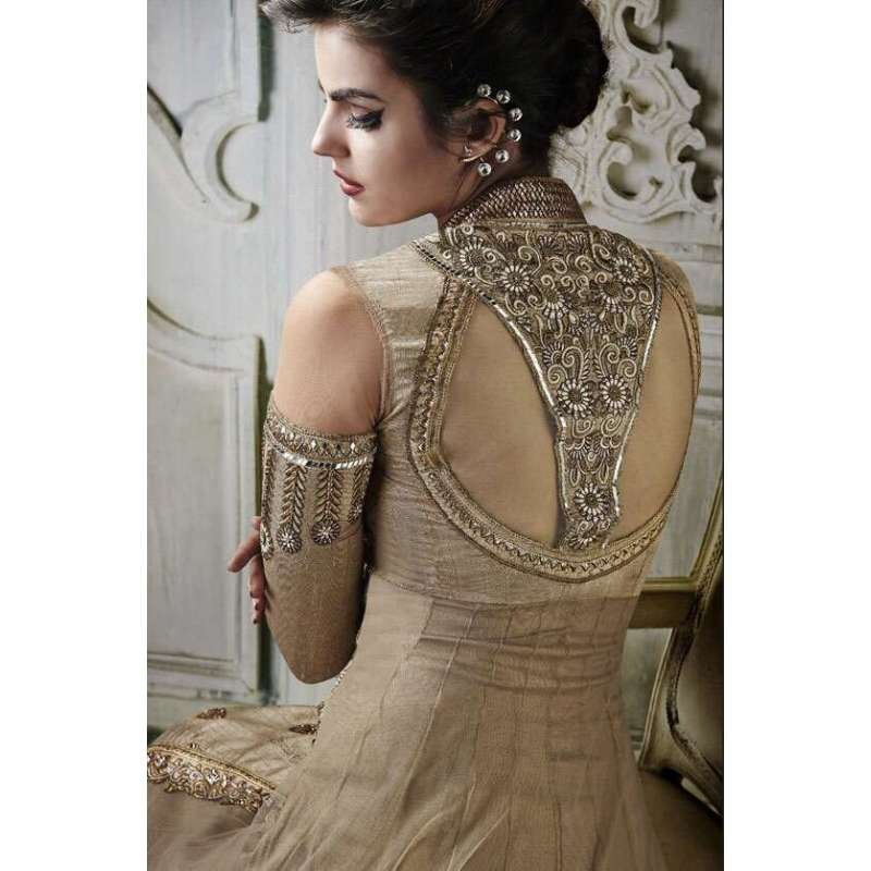 Look grandeur and gorgeous in this beige floor length khwaab designer Anarkali suit. Beautiful Un-stitched fabric in georgette, chiffon, silk and net with Heavy thread work and embellishments. shantoon Bottom with chiffon Dupatta. Party, wedding Wear