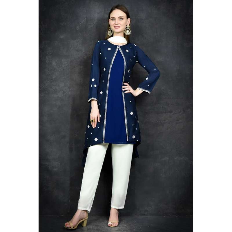 Jacket style suit with Resham embroidery with matching inner & contrast trouser and dupatta, perfect for any occasion.