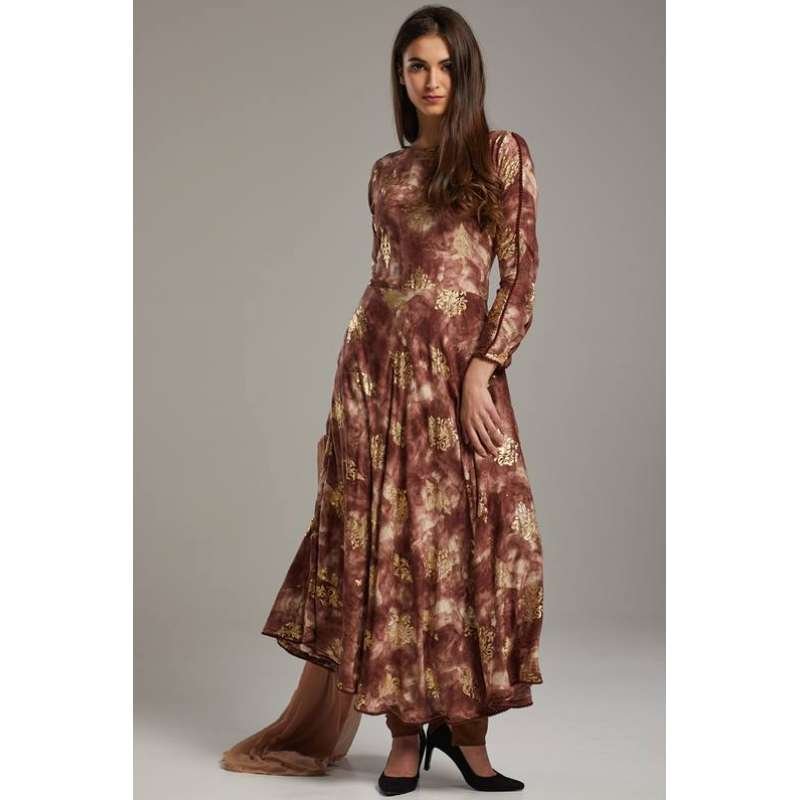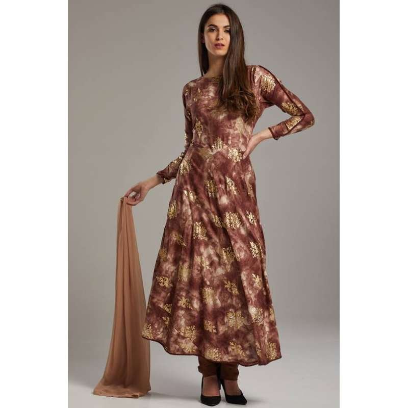 Elegant Brown Foil Printed Circular Style Anarkali Dress