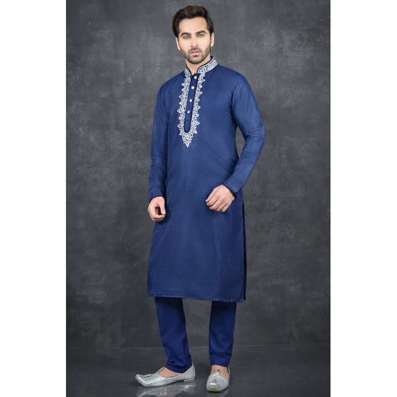 CLASSIC BLUE EMBROIDERED MEN'S KURTA PAJAMA SUIT