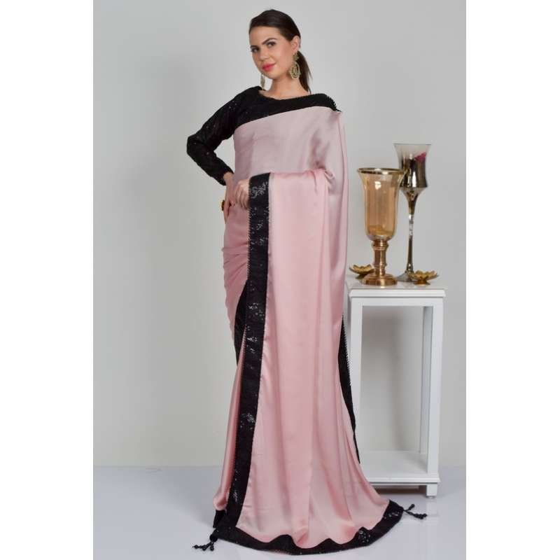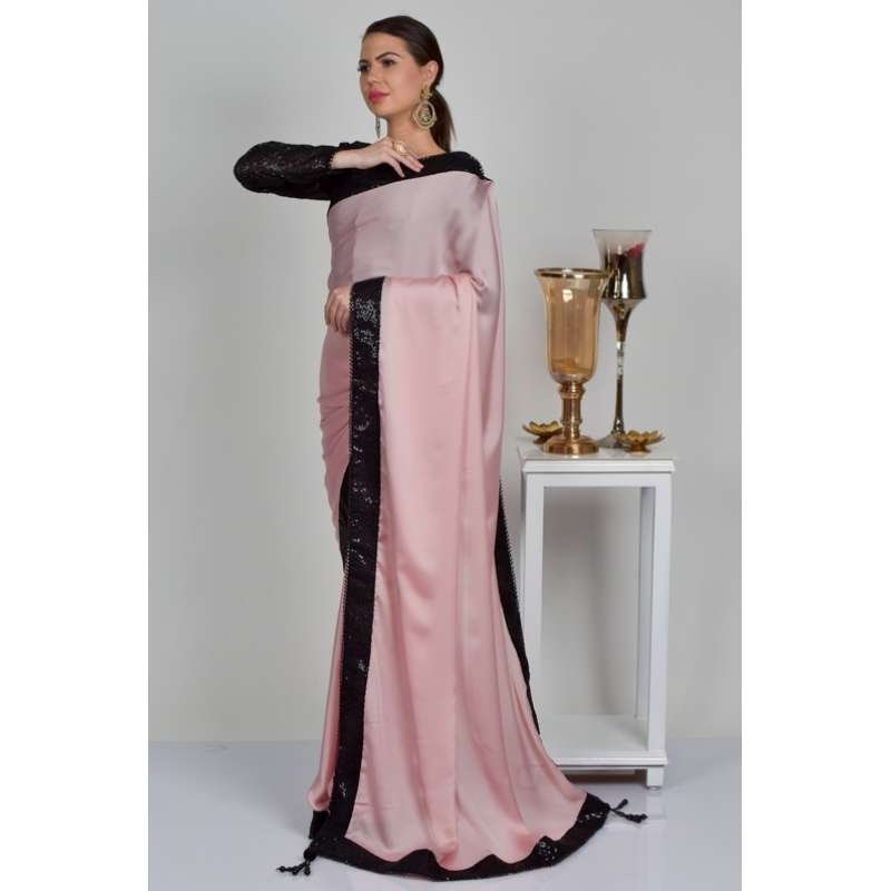This beautiful satin georgette saree with a black sequin border finished with pearl lace and teamed with a beautifully stitched sequin embroidered blouse.