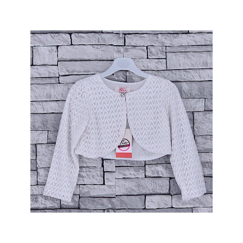 Girls ivory white zigzag lace mesh cropped bolero style jacket with full lining and diamante crystal button fastener.