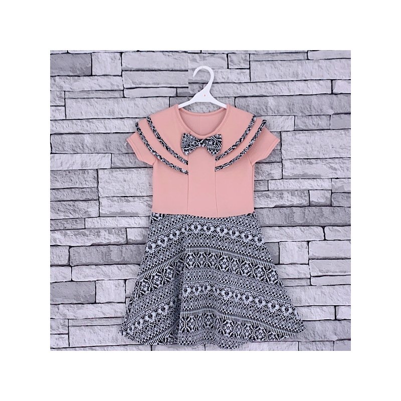 Girls salmon pink midi skater dress with aztec monochrome motif print skirt, bow appelique, capped sleeves and double lapel piped collar.