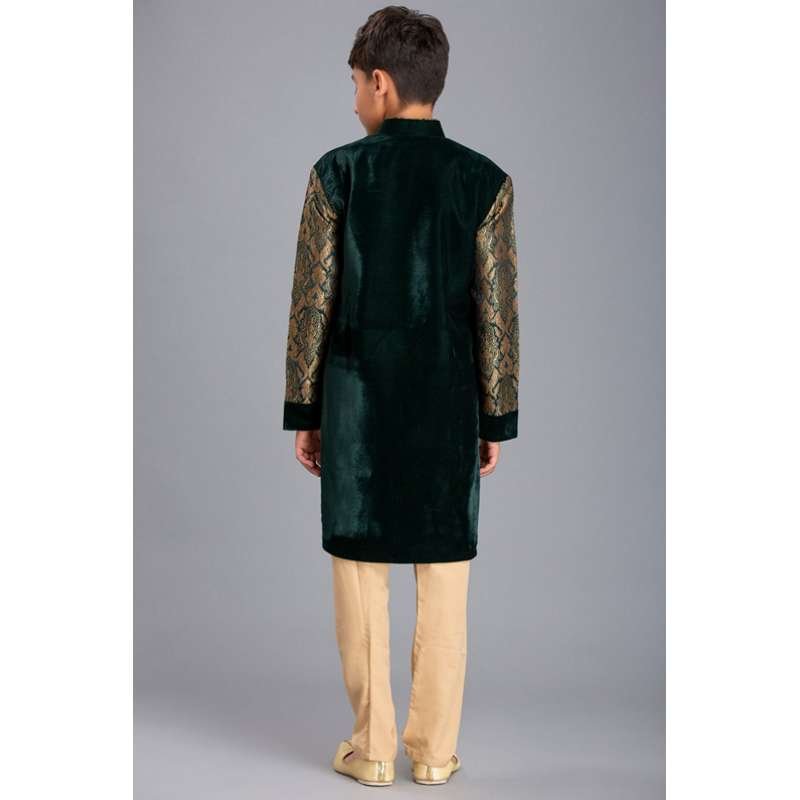 Fine dark green velvet jacket with brocade sleeves, identical pocket square and diamante buttons paired with beige trousers.