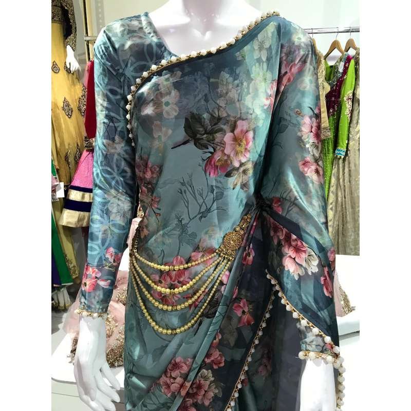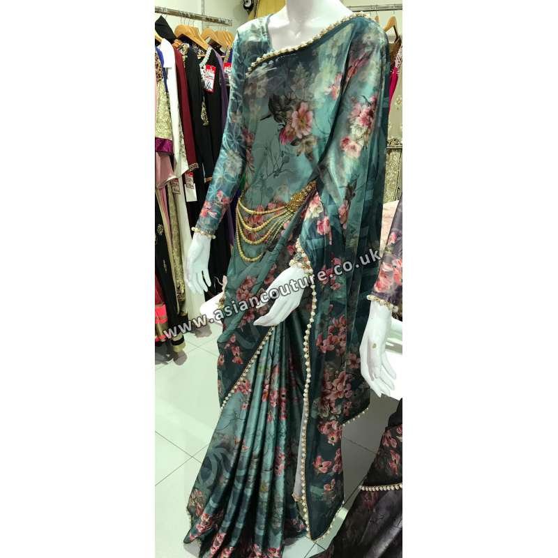 GREEN PAKISTANI DESIGNER FLORAL PRINTED SATIN SAREE