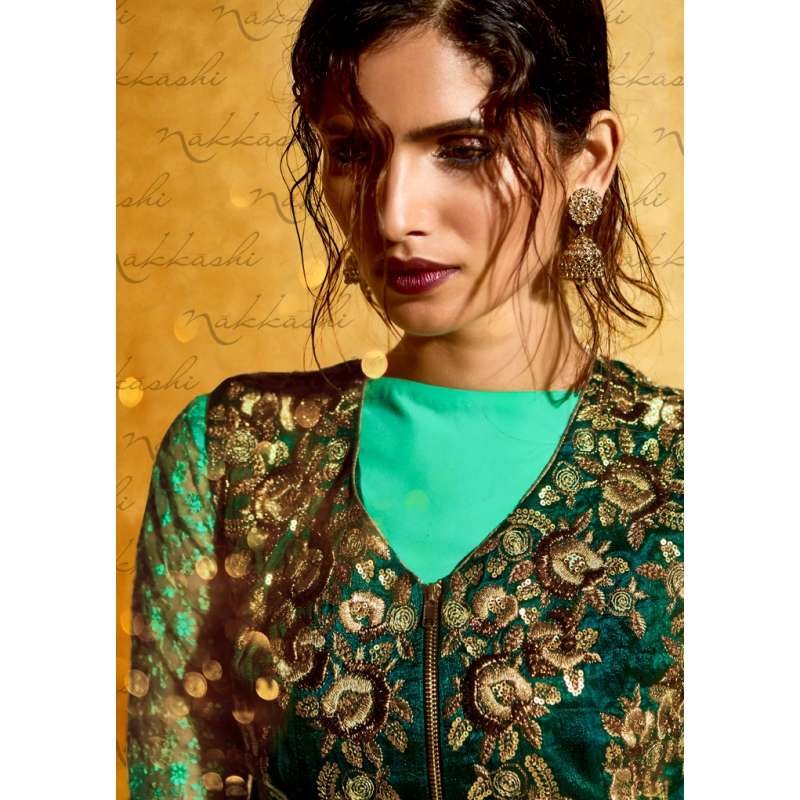 NAKKASHI Gold Dust stylish Suit with excellent. Excellently stylish with embroidery, handwork and beautiful cut and finish !! Beautiful sea green georgette with amazing fall of in kali.resham thread embroidery on sleeves. heavy zari work on aqua green jacket. sea green chiffon dupatta. sea green santoon for bottom