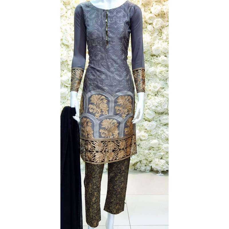 Grey Linen Resham Embroidered Readymade Salwar Suit