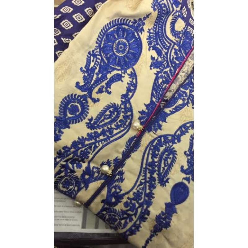 Blue embroidered top with off white beige colour bottom.