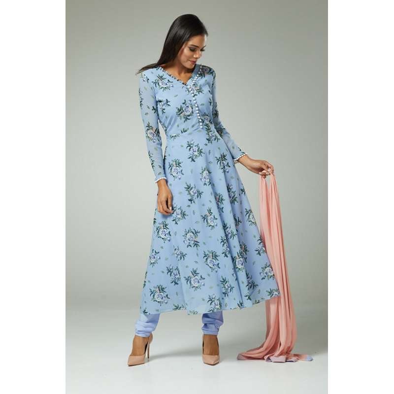 • Beautiful bold print A-Line dress with faux buttons paired with churidar and contrast dupatta.