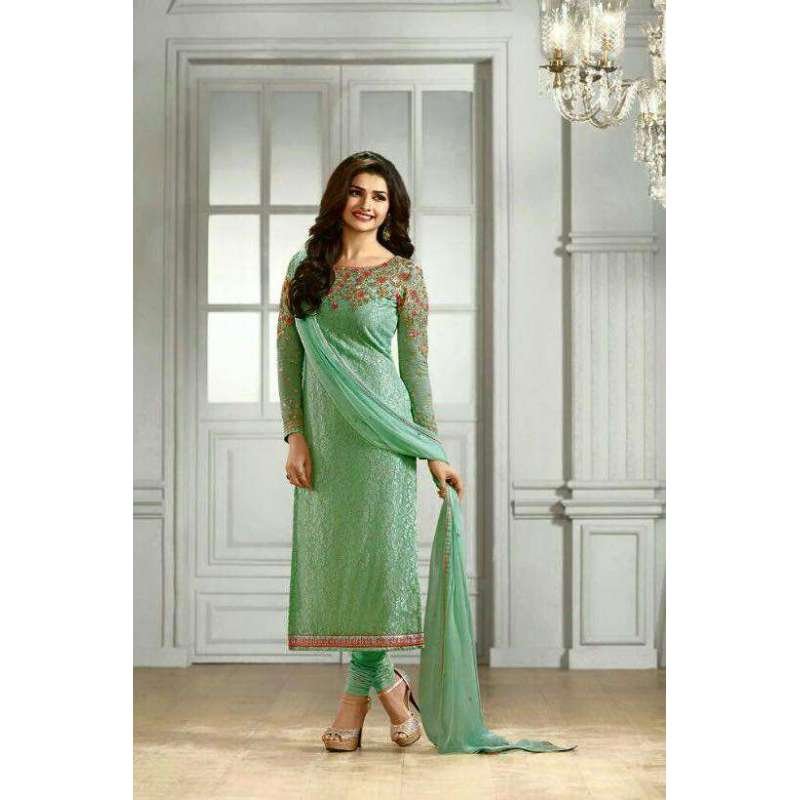 Beautiful Unstitch fabric in pure georgette chiffon with heavy thread work and embellishments. Santoon silk bottom with pure brasso dupatta.