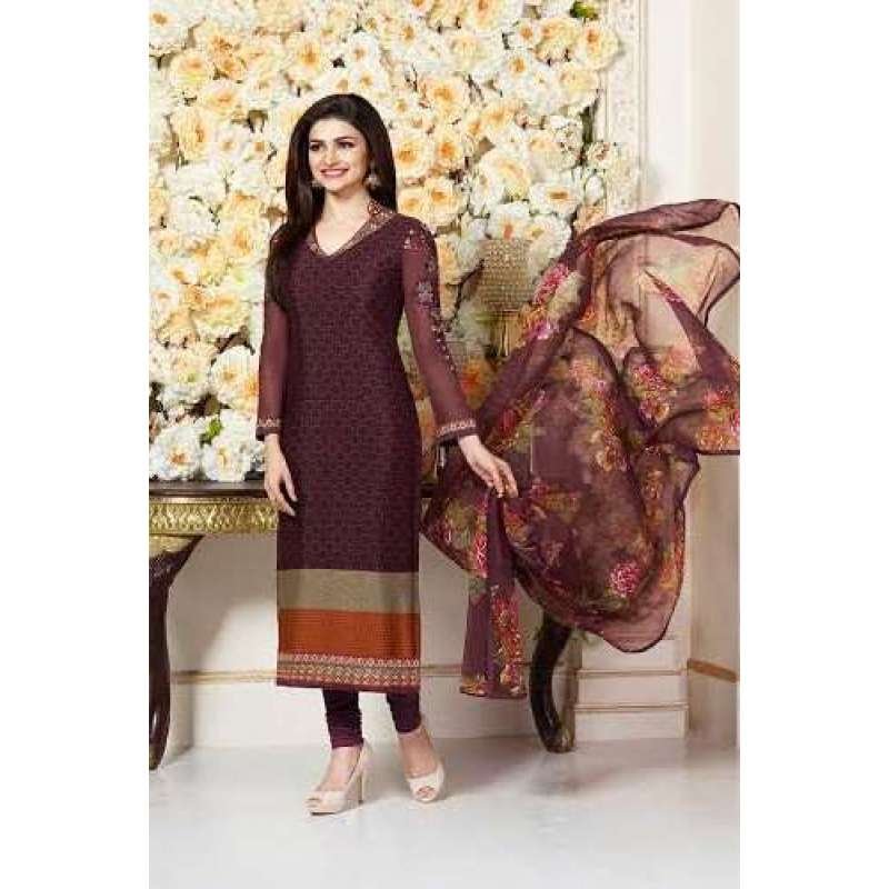Asian Couture presents latest styles for you modelled by Prachi Desai. Georgette straight cut style suit modeled by prachi desai. this dress is beautified with zari, sequins, embroidered patch work at bottom and neck of the kameez.The mesmerizing style is made in Soft & luxe crepe fabric for you to experience luxury & Royalty. This suit comes with matching crepe material for churidar/salwar and chiffon dupatta .