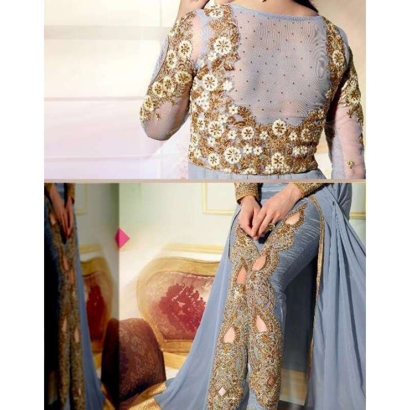 Georgette and comes with Heavy Embroideries on Front and back. The Dresses are Long, can be stitched upto Floor Touching Lengths, Sleeves Heavily Embroidered.