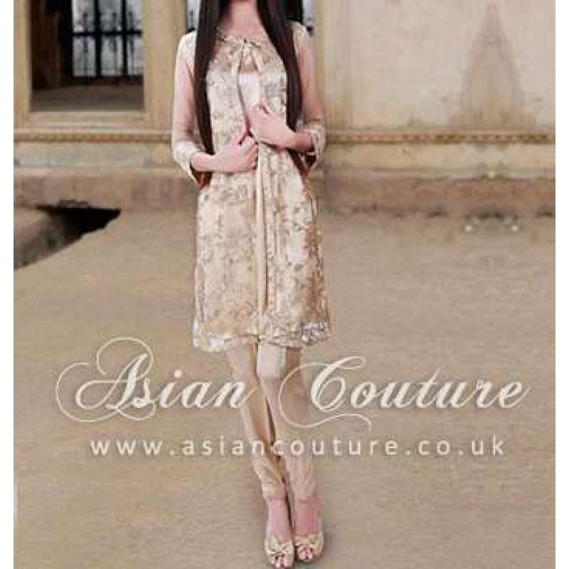 Beautiful Beige coloured Straight Cut Kameez. Beige emboridery on the front and a maroon and green stylish work on Back. Large Border on the bottom of the kameez and cuffs of sleeves, in Gold intertwinned with green and maroon embroidery.