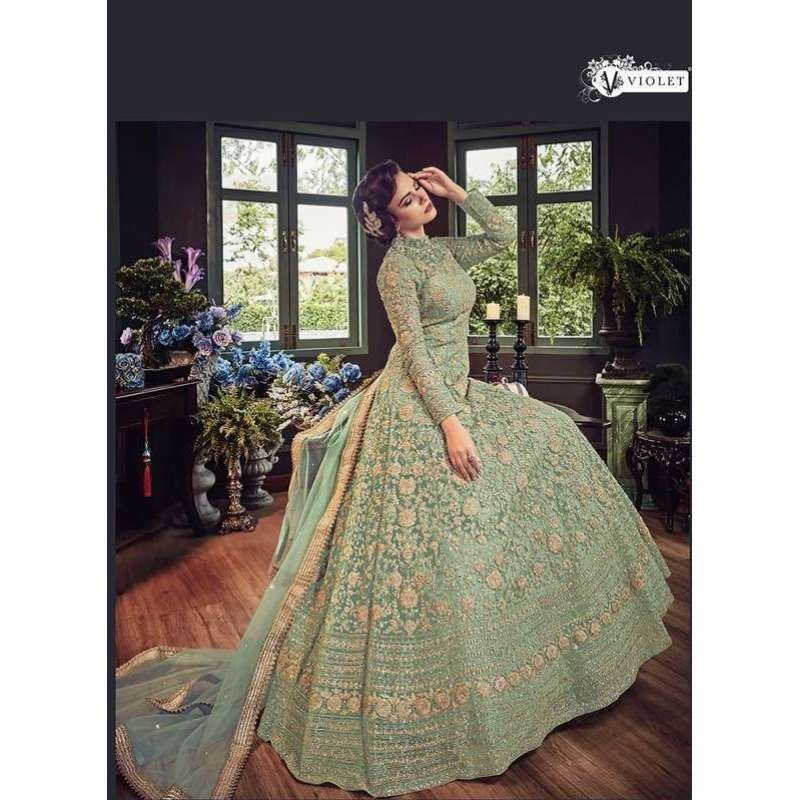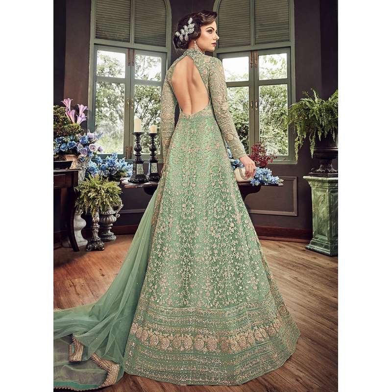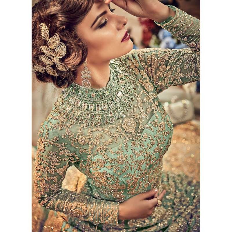 SAGE GREEN HEAVY EMBROIDERED INDIAN WEDDING & EVENING GOWN