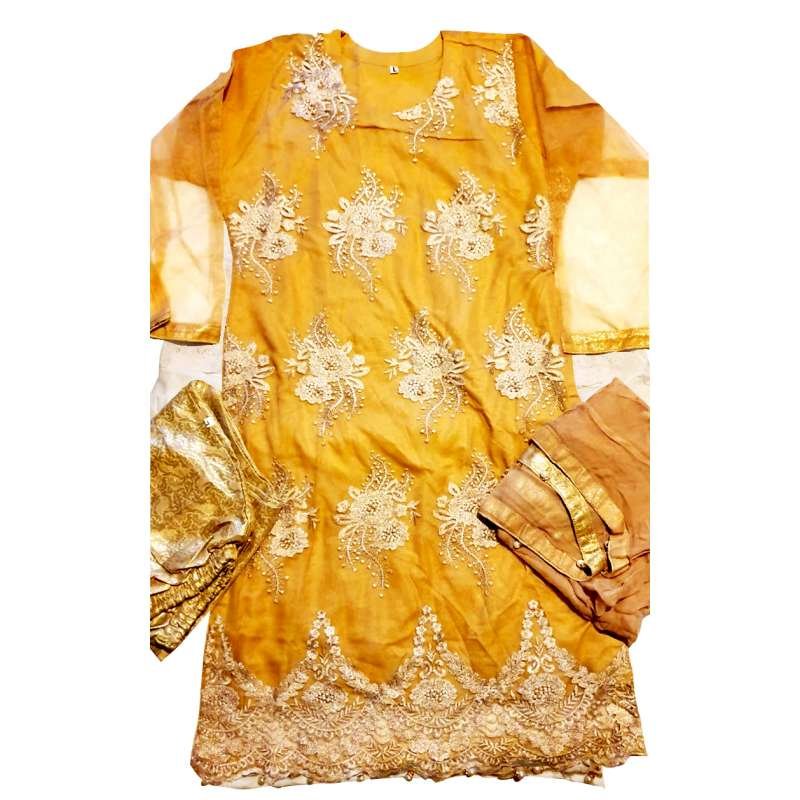 Readymade embroidered suit comes with brocade trouser and bead lace border scarf. (Size 36)