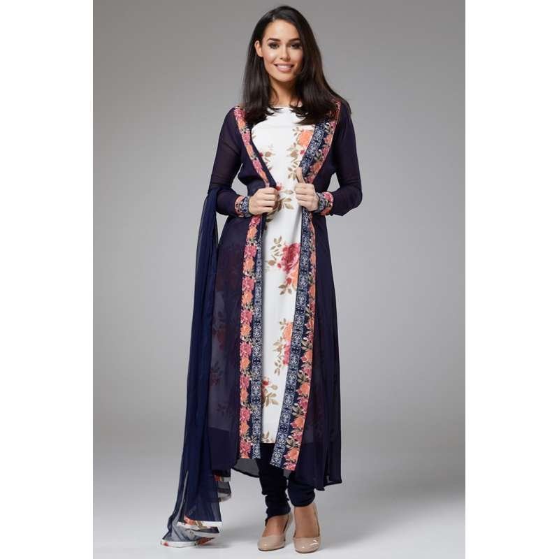 NAVY BLUE AND WHITE FLORAL INNER JACKET STYLE READYMADE DRESS