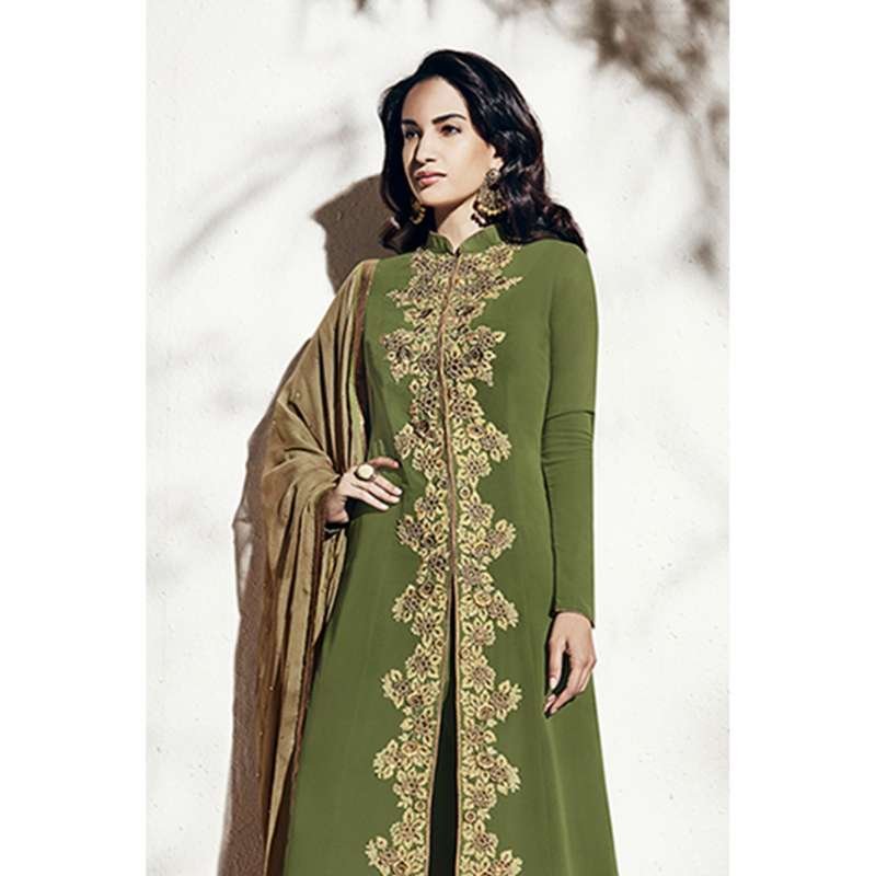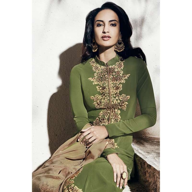 Olive Green Georgette Top With Matching Santoon Bottom. Jack Look Top Embellished With Zari And Crystal Work. This Dress Complete With Beige Chiffon Dupatta With All Over Hand Bootis.