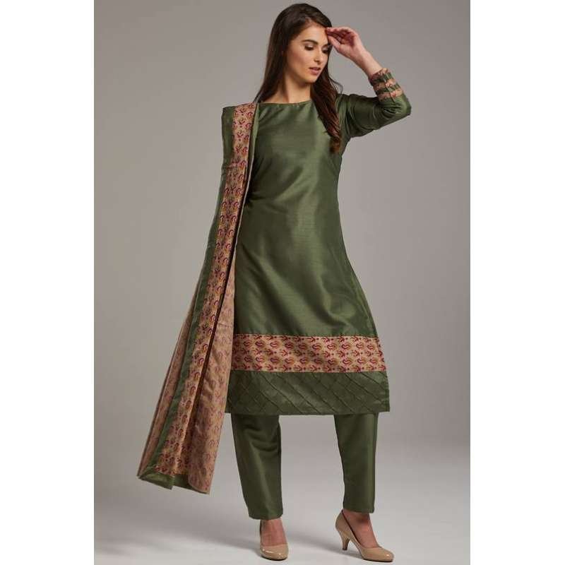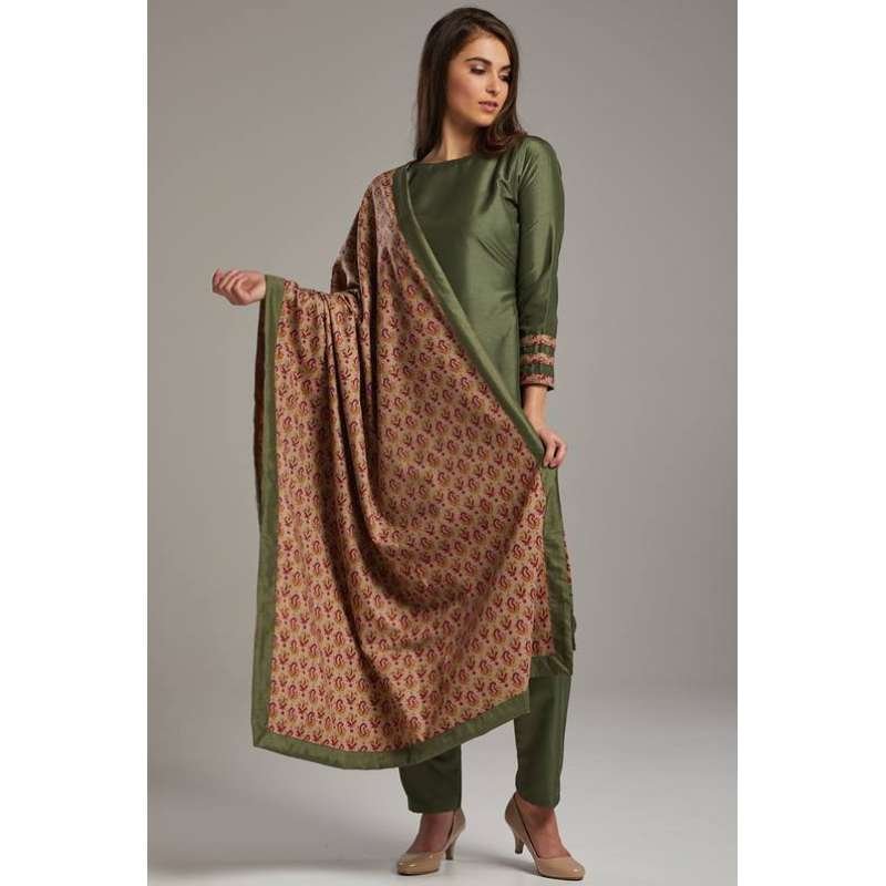 A beautiful kutra accesorised with pin tucks detailings, paired with matching bottom and printed dupatta finished with plain border.