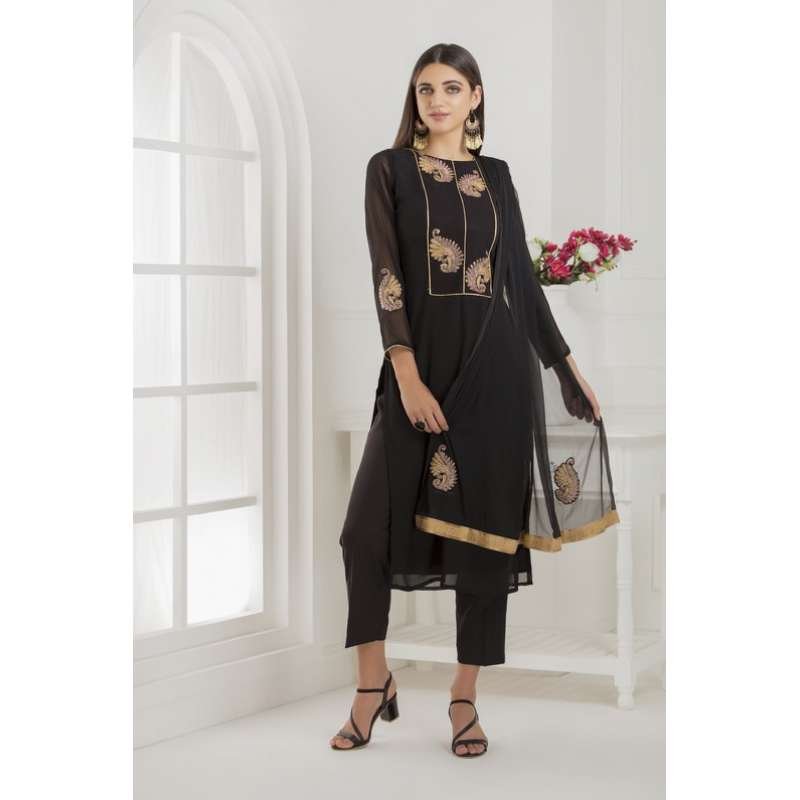 - Stylish Black straight long dress shirt with beautiful sequined embroidery In ready-made for Parties and events