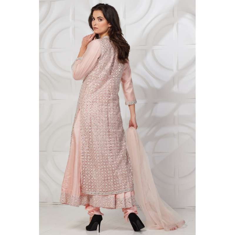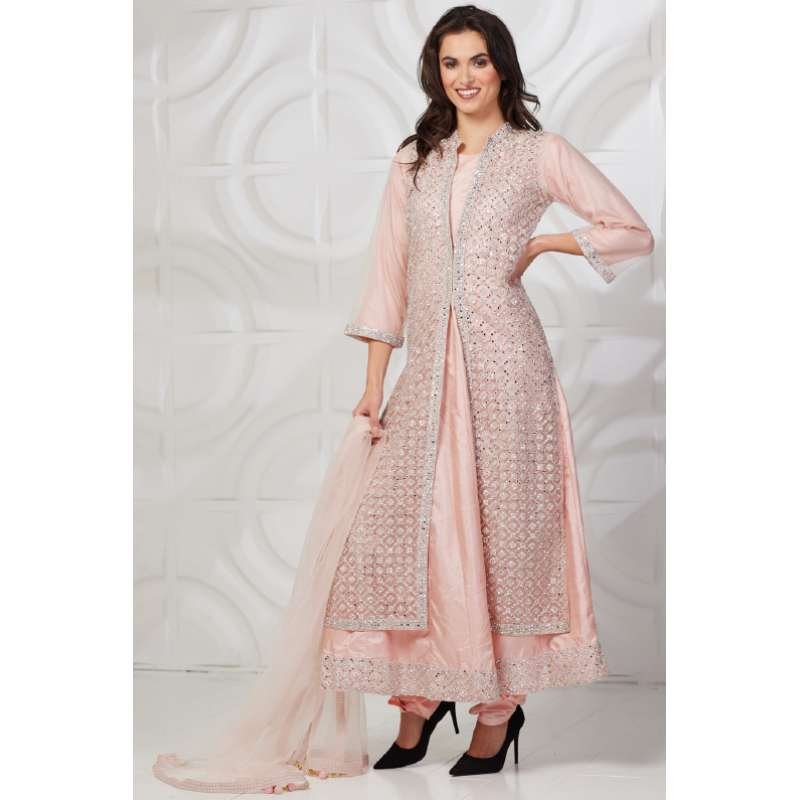 Beautiful peach color frock style kurta with heavy net embroidered jacket, It is paired with matching churidaar and nat dupatta with four side border and latkans.