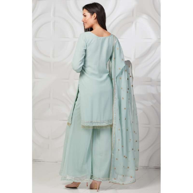 Beautiful Georgette kurti with gold embroidery on neckline and sleeves. It is paired with same color palazzo with gota patti on ends and palin georgette gold embroidered dupatta with four side gold lace.