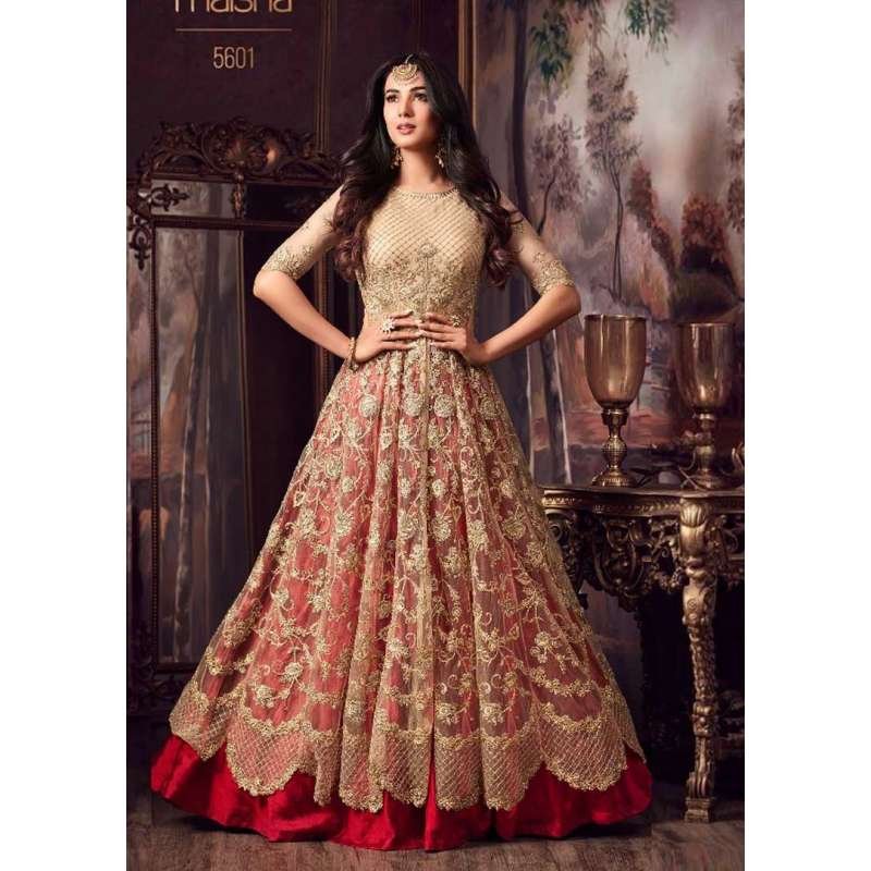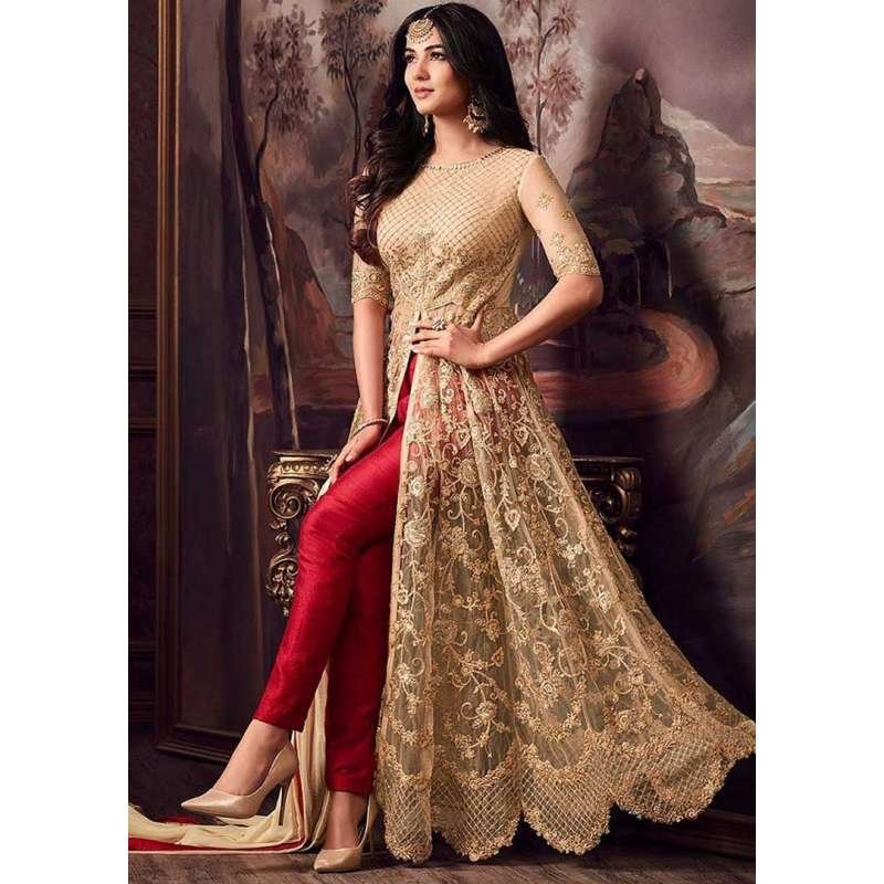 Stunning new designer anarkali style dress in net. This is beautifully crafted with zari,zarkan and hand work. This Anarkali Dress comes with matching chiffon dupatta and coming with inner and bottom