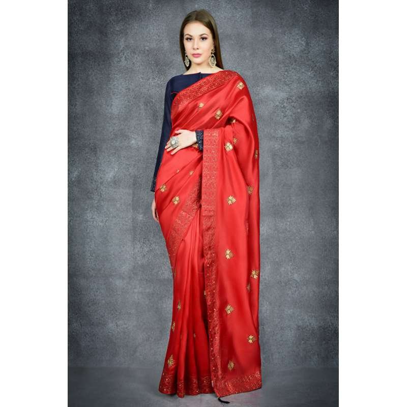 A vibrant red embroidered saree with diamonte work. It comes with a princess-cut contrast blouse which also includes the diamonte work on the sleeve.