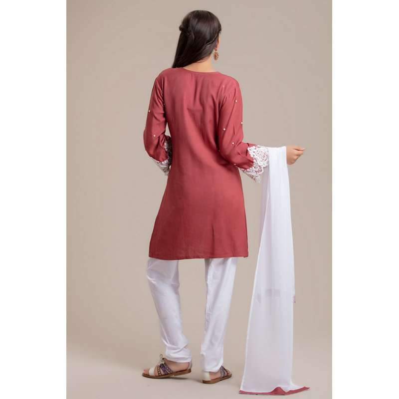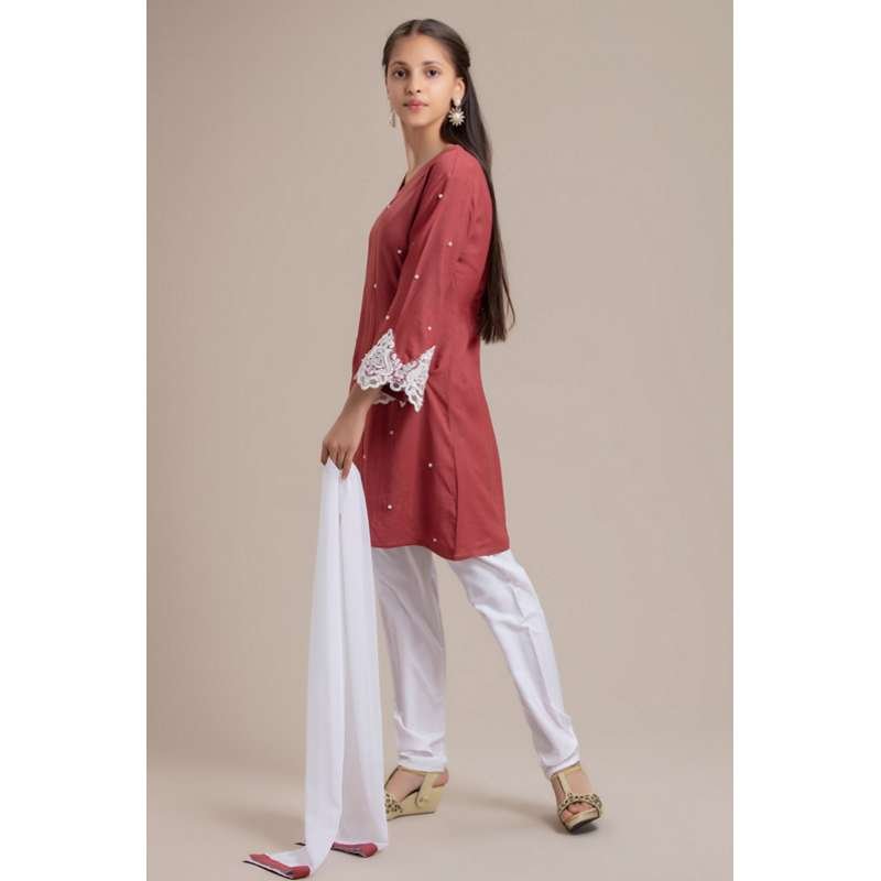 Simple girls suit with scattered pearls on shirts and lace highlightment on sleeves with complementary dupatta and churidar.