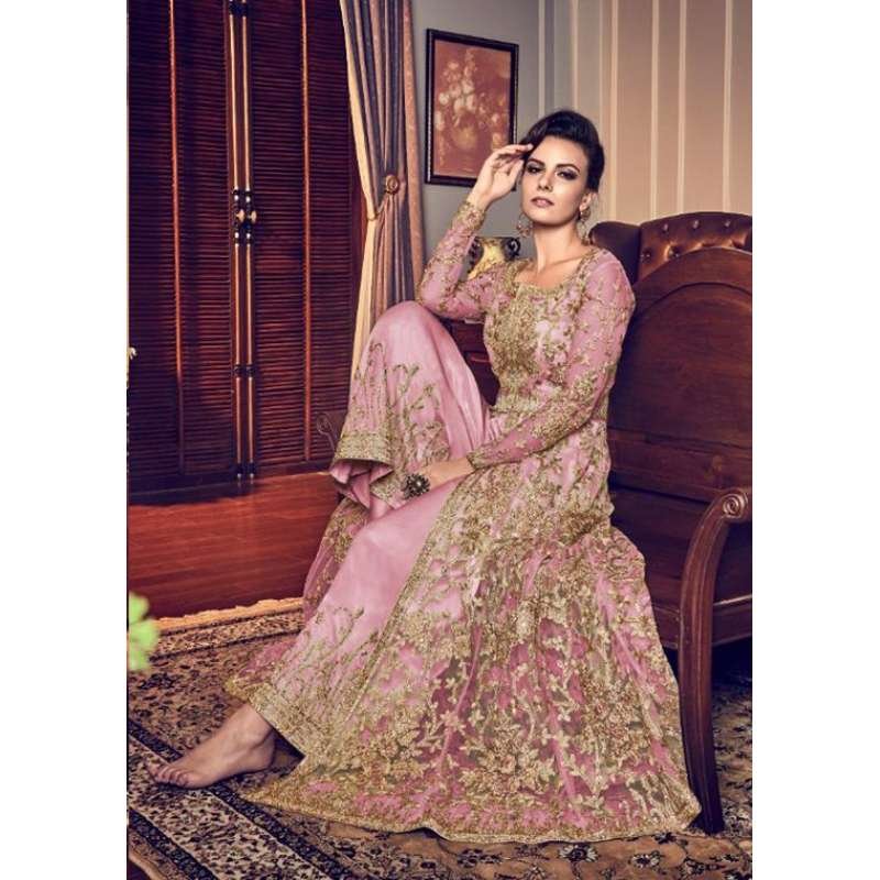 ROSE PINK INDO WESTERN SLIT STYLE NET DRESS