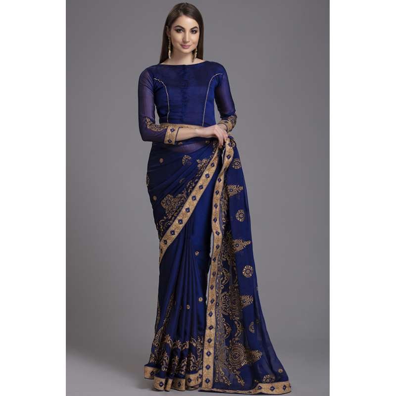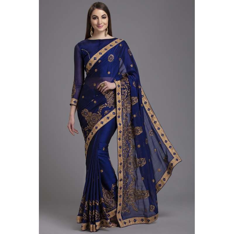 - Elegant saree in blue colour with rich threadwork detailing in golden colour