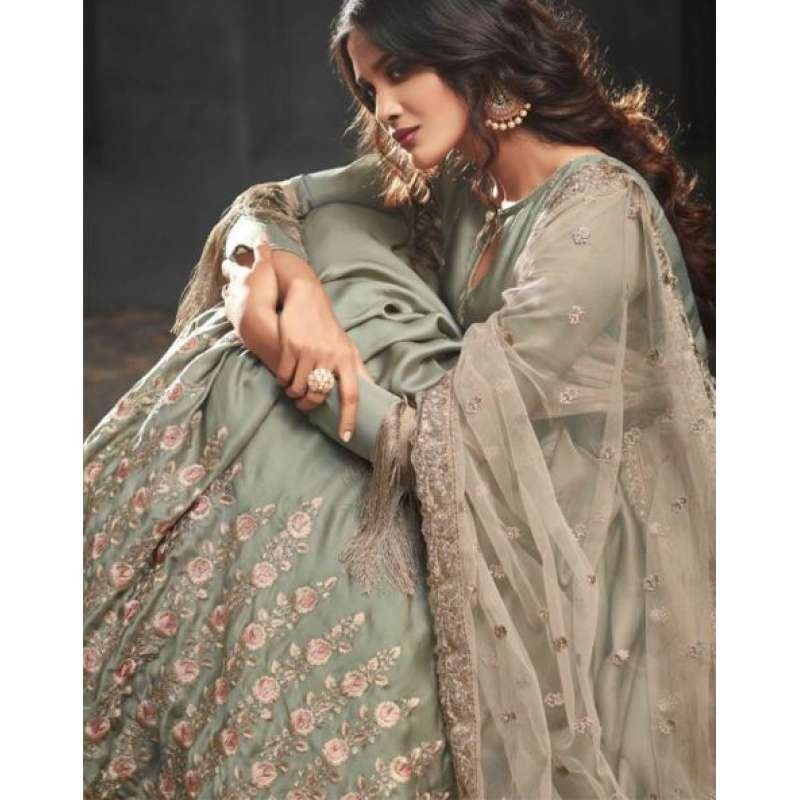 SILVER GREEN INDIAN PAKISTANI WEDDING WEAR GOWN