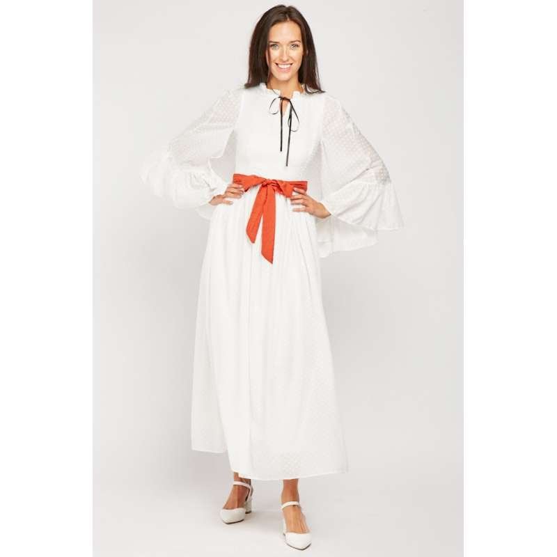 White Flared Sleeve Belted Maxi Dress.