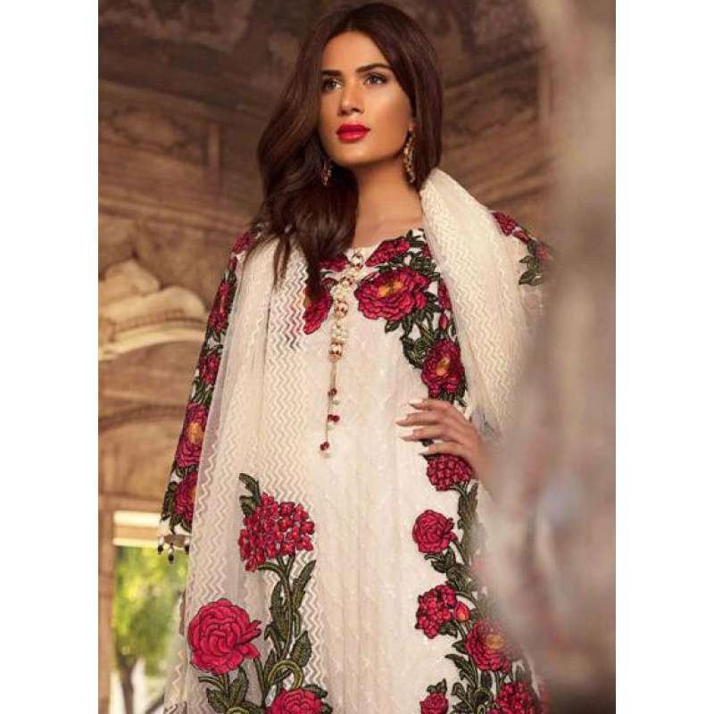 WHITE ROSE MOTIF FOX GEORGETTE PAKISTANI DESIGNER SUIT
