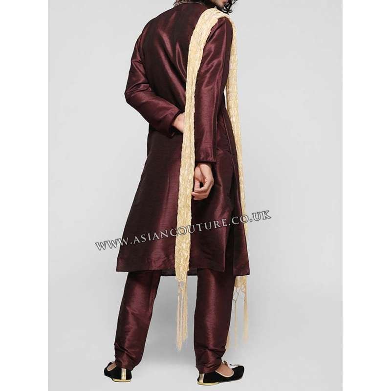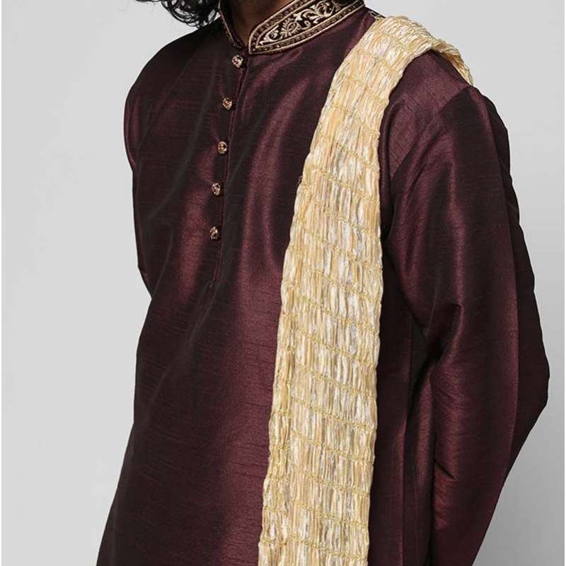 This wine silk kurta with side slits and pockets features velvet band collar neckline accentuated with gold zari embroidery, piping, and diamonte embellished buttons. It is paired with matching silk churidaar and contrasting polycotton scarf